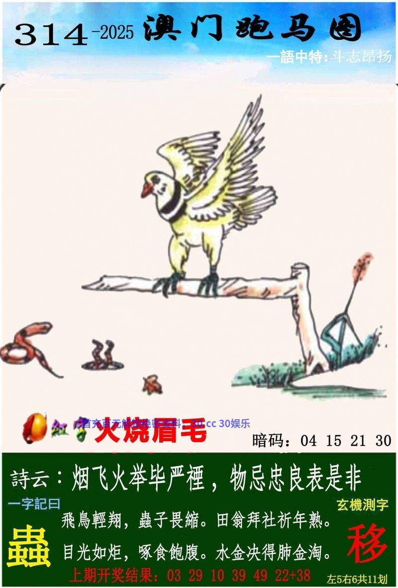 | 315期一字記曰:【达】开:虎04准 箭在弦上,蓄势待发,但求一击可必杀。伺机而动,细心大胆,下定决心目标达。《祁》 解:下定决心目标达解鸡龙蛇猴虎猪。 生肖:鸡龙蛇猴虎猪 |