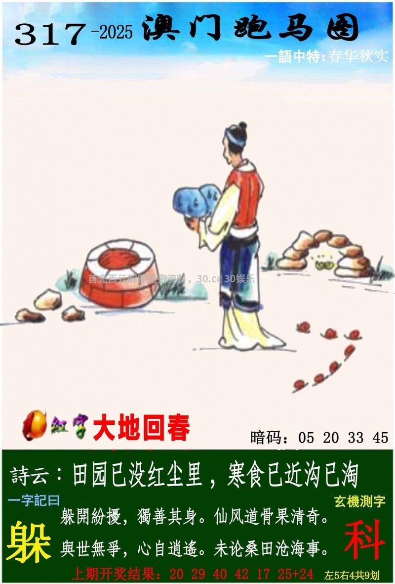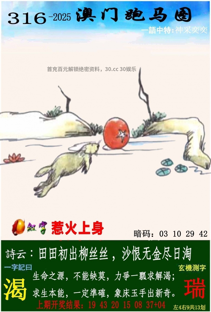 | 316期一字記曰:【渴】开:马24准 生命之源,不能缺莫,力争一瓢求解渴。求生本能,一定准确,象床玉手出新奇。《瑞》 解:沙恨无金尽日淘:尽日淘解蛇马兔龙羊猴。 生肖:蛇马兔龙羊猴 12码:13.49.24.36.03.15.02.14.11.35.22.46 |