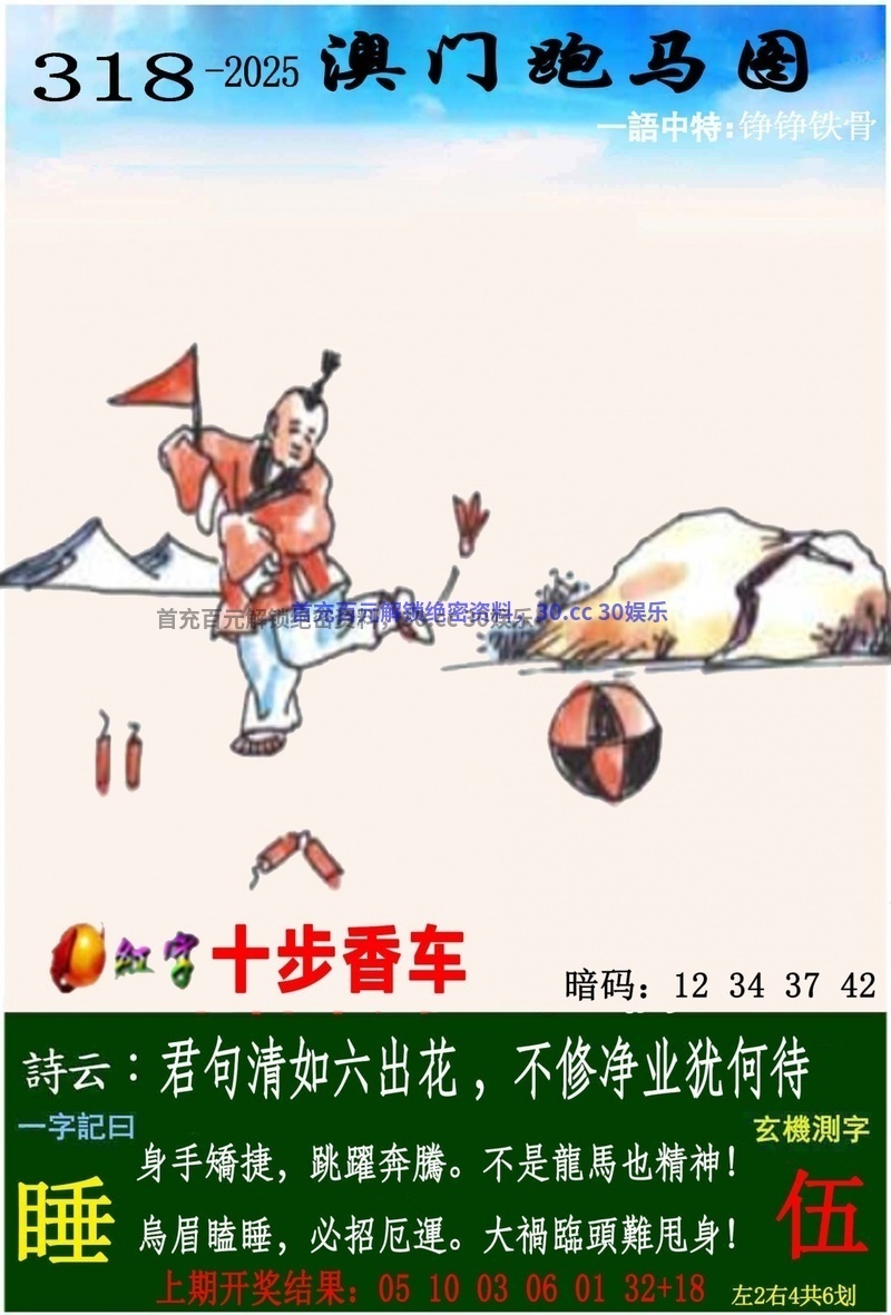 | 318期一字記曰:【睡】开:鼠06准 身手娇捷,跳躍奔腾,不是龙马也精神。乌眉瞌睡,必招厄运,大祸临头难甩身。《伍》 解:大祸临头难甩身:大祸临头解凶肖猪牛狗虎鼠猴。 生肖:猪牛狗虎鼠猴 |